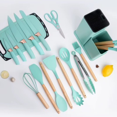 Acest set elegant și multifuncțional include tot ce ai nevoie pentru gătit și servire: spatule, linguri, palete, pensulă, tel, clești, cuțite, foarfece, tocător și suport organizator.